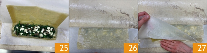 Cierra de nuevo con la masa filo 25 de modo que se forme un rollo envuelto por el papel de horno 26. Ahora desenrolla con cuidado el papel de horno 27.