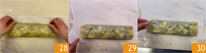 Sella bien la parte de la unión con una ligera presión 28. Practica 5 cortes en diagonal sobre la superficie 29 y adorna con semillas de sésamo blancas y negras 30 y semillas de amapola.