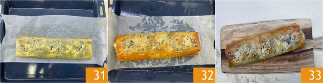 Coloca el strudel en una bandeja, con la parte de la unión hacia abajo 31. Hornea en horno estático precalentado a 200 durante 20 minutos. Saca del horno 32 y deja templar. ¡El strudel de masa filo con salchicha y espinacas está listo para disfrutar 33!