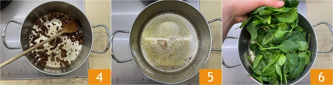 Dora la salchicha hasta que esté bien dorada 4, después pásala a un bol. En la misma sartén calienta otro chorrito de aceite con un diente de ajo 5, luego añade las hojas de espinacas 6.