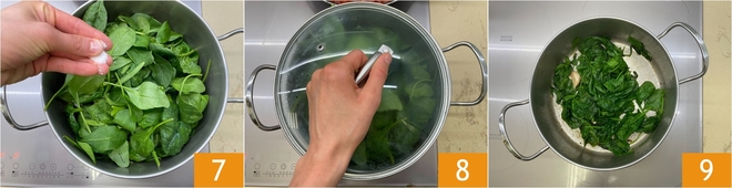 Sazona con sal 7, cubre con la tapa 8 y continúa la cocción durante unos 3 minutos a fuego medio, o hasta que las espinacas estén tiernas. En este punto quita la tapa y continúa la cocción un minuto más para que se sequen 9.