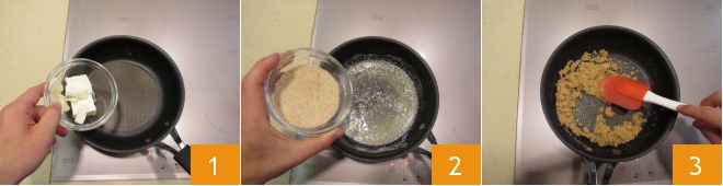 Para preparar el strudel de pera y chocolate, empezad vertiendo en una sartencita la mantequilla 1. Dejad que se derrita y, acto seguido, añadid el pan rallado 2 y doradlo durante un par de minutos, removiendo continuamente. En cuanto esté listo, reservadlo en un cuenco 3