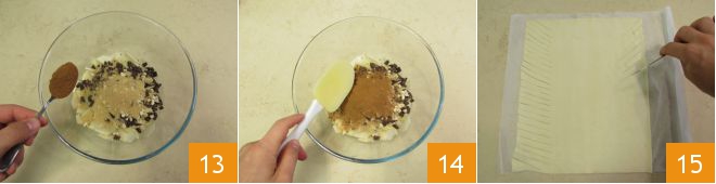 la canela 13. Mezclad bien todo 14. Desenrollad la masa de hojaldre e imaginad que la dividís en 3 partes a lo largo. En la franja central deberéis poner el relleno; en las franjas laterales practicad cortes oblicuos a 1 cm de distancia unos de otros 15.