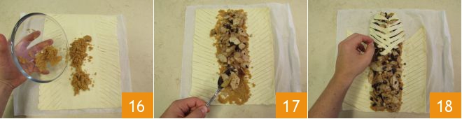 Luego cubrid la parte central primero con las migas tostadas 16 y después con el relleno de pera y chocolate 17. Levantad las tiras que habéis hecho a los lados, una a una, llevándolas hacia el centro de forma alterna 18.
