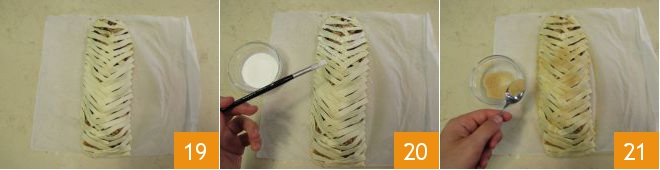 De este modo obtendréis un efecto en forma de rejilla 19. Si sobra algún resto de masa, podéis descartarlo. Por último, pincelad las tiras con un poco de nata 20 y espolvoread con azúcar moreno 21.