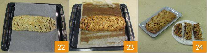 Hornead en horno estático, ya caliente a 200 °C, durante unos 20 minutos 22. Una vez hecho 23, dejad enfriar completamente el strudel de pera y chocolate antes de cortarlo y degustarlo 24.