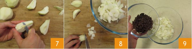 Picad tanto las almendras 4 como el chocolate 5 y ponedlo todo aparte. Bien, a continuación trabajad con las peras. Después de pelarlas y cortarles los dos extremos 6,