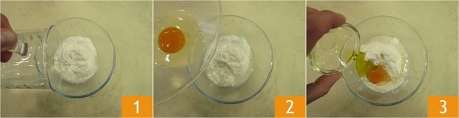En un bol, verted la harina, el agua 1, el huevo 2 y el aceite 3.