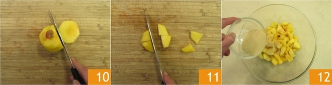 Cortad la pulpa alrededor del hueso y eliminadlo 10. Reducir la pulpa de los melocotones en trozos de unos 3 cm 11 y traspasadlos a un bol grande. Agregad a los melocotones el azúcar moreno 12.