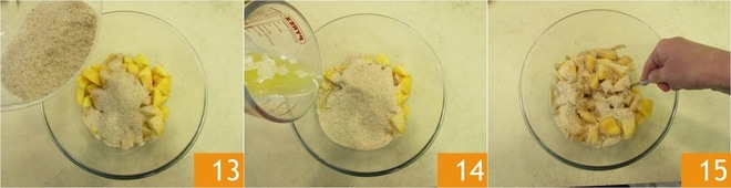 Añadid también el pan rallado 13 y la mantequilla derretida templada 14. Mezclad bien 15.