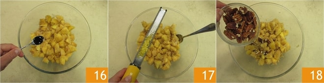 Añadid la vainilla 16, la ralladura de limón 17 y las nueces pecanas 18.
