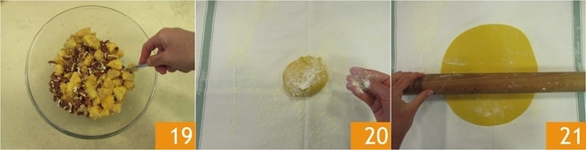 Mezclad bien 19 y reservad. Derretid la mantequilla que servirá para untar el strudel. Colocad un paño en la superficie de trabajo y espolvoread con un poco de harina. Transferid la masa del strudel al paño y añadid un poco más de harina 20. Comenzad a estirar la masa con el rodillo hasta obtener un espesor de unos 4 mm 21.