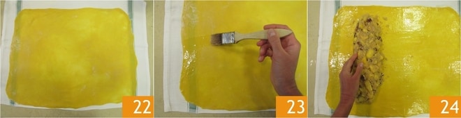 Ahora, muy delicadamente, continuad estirándola con las manos, hasta obtener un rectángulo muy delgado, casi transparente 22. Untad con una parte de la mantequilla derretida 23 y transferid la mezcla de melocotones al lado izquierdo del rectángulo 24, dejando un espacio libre.