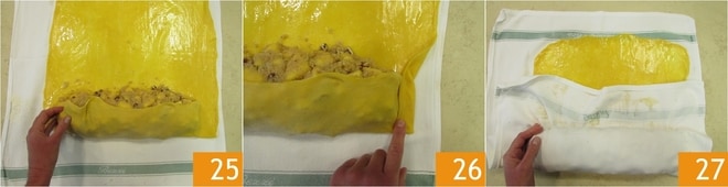 Levantad entonces la masa a la izquierda del relleno y doblarla, intentando cubrirlo lo más posible 25. Luego doblar los bordes laterales, pellizcando la masa con los dedos 26. Ahora enrollad el strudel ayudándoos con el paño 27.