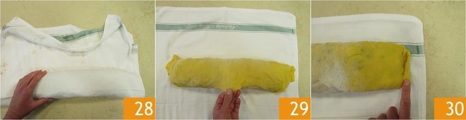 Una vez que hayáis enrollado completamente el strudel 28, abrid el paño, extended aún más la última capa de masa 29 y sellad bien los extremos 30.