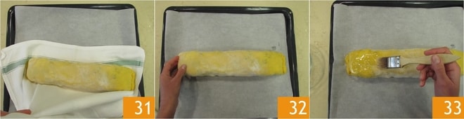 Ayudándoos con el paño, transferid el strudel a una bandeja forrada con papel de horno 31. Retirad cuidadosamente el paño 32 y untad toda la superficie con la mantequilla derretida restante 33.