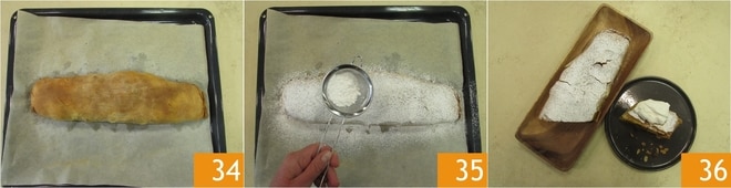 Coced en horno estático precalentado a 200° durante 35 minutos. Sacad del horno 34 y dejad templar. Espolvoread con azúcar glas 35 y servid el strudel de verano de melocotones 36.