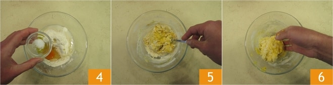 Añadid también la sal 4 y mezclad los ingredientes con un tenedor 5. Luego trabajad la mezcla con las manos 6.