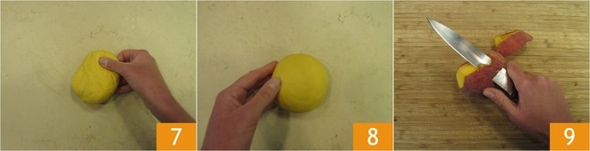 Cuando hayáis obtenido una masa homogénea, transferidla a una superficie y trabajadla hasta obtener una masa suave, lisa y elástica 7. Formad una bola 8, cubridla con film transparente, o con un bol, y dejad reposar a temperatura ambiente durante 30 minutos. Mientras tanto, ocupaos del relleno: derretid la mantequilla y reservadla, luego pelad los melocotones 9.