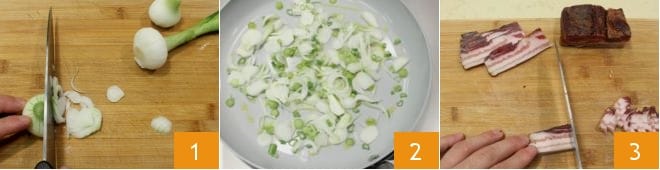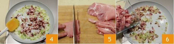 y agrégala a las cebolletas 4, dorando bien. Corta el lomo en tiras 5, únelas también a las cebolletas y a la panceta hasta que estén doradas 6.