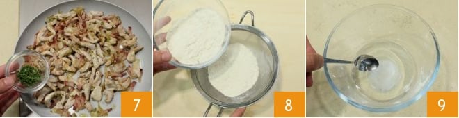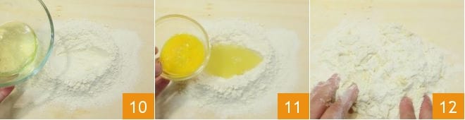 añadiendo luego el aceite e incorpora la mezcla resultante a la harina 10. Añade también el huevo batido 11 y amasa los ingredientes 12.
