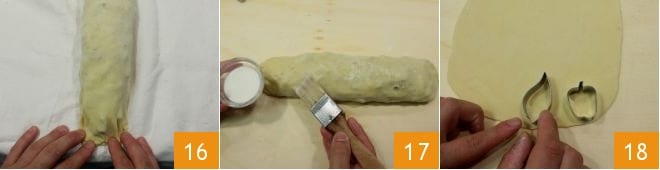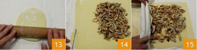 Cuando hayas conseguido una masa homogénea y elástica, estírala con el rodillo sobre un paño 13, que servirá para enrollar luego el strudel. Extiende una hoja de masa de 2-3 mm de grosor, que mida aproximadamente 40 x 40 cm. Distribuye la mezcla ya fría dejando 2-3 cm de los bordes y ajusta con la punta de un cuchillo el cuadrado para darle una forma más regular 14. Pinta ahora los bordes con agua y enrolla, con la ayuda del paño, el strudel 15.
