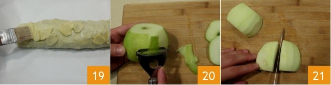 distribúyelas luego sobre el strudel y vuelve a pintar todo con leche 19. Cocina en horno precalentado a 200° durante 30 minutos (si es ventilado, a 180° durante 20 minutos), en la rejilla intermedia, hasta obtener un bonito dorado. Mientras tanto, ocúpate del acompañamiento. Pela la manzana eliminando el corazón 20, corta luego en cuartos 21.