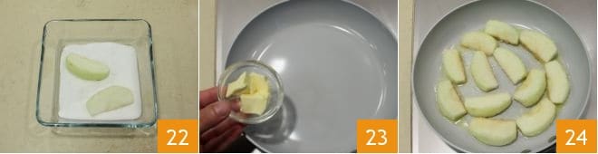 Pon ahora el azúcar en un bol y pasa por su interior los trozos obtenidos, de ambos lados 22. En una olla, derrite suavemente la mantequilla 23 y añade luego las manzanas azucaradas 24, distribuyéndolas ordenadamente. Déjalas dorar por ambos lados.