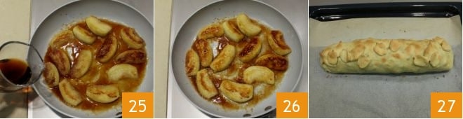 Riégalas en este punto con el marsala 25 y deja que evapore, asegurándote de que se seque sin quemarse 26. Finalmente, saca del horno el strudel, que puedes presentar entero o en rodajas acompañado de las manzanas tibias 27.