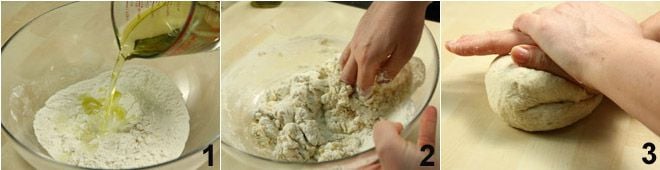 Preparad la masa del strudel reuniendo en un bol la harina tamizada con la sal y el agua mezclada con el aceite 1, amasad a mano dentro del cuenco unos instantes 2 y trasladad a una superficie enharinada para terminar de amasar 3;