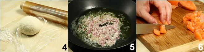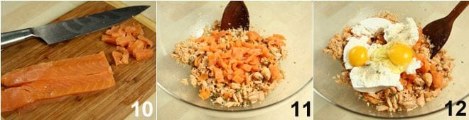 Verted la mezcla en un bol y dejadla templar; mientras tanto, cortad el salmón ahumado en trozos 10 y vertedlo en el bol 11 junto con: ricotta, un huevo entero más una yema 12.