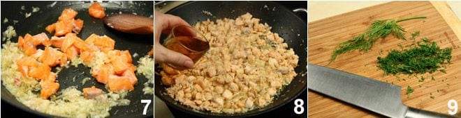 e incorporadlos en la sartén para dorarlos 7; una vez cocidos, agregad el chupito de brandy 8 y dejad evaporar, luego salád, picad el eneldo 9 y añadidlo al salmón en la sartén, apagad el fuego.