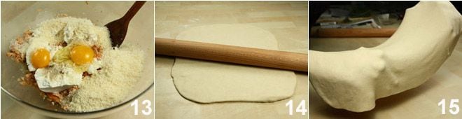 Mientras tanto, extendéis la masa en una superficie ligeramente enharinada 14 y haced un rectángulo que luego podréis ampliar con las manos enharinadas 15