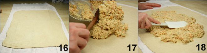 y colocad sobre un paño de cocina limpio 16. Extendéis el relleno sobre la masa 17 teniendo cuidado de dejar los bordes vacíos: 18 en uno de los dos lados más largos dejad 5 cm de masa vacía.
