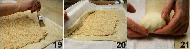 Pincelad con la clara sobrante los bordes vacíos 19 de la masa extendida y, ayudándoos con el paño, enrollad el strudel de salmón y ricotta empezando desde el lado más largo del rectángulo 20.
