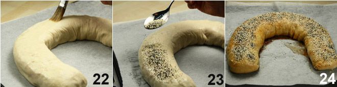 Pinceladlo con la clara 22 y espolvoreadlo con semillas de amapola y sésamo mezcladas entre sí 23. Hornead en horno precalentado a 160° durante unos 50-60 minutos.