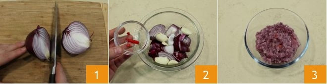 Para preparar el estofado especiado de pollo con cacahuetes, limpia la cebolla roja y córtala en trozos 1; colócala en un bol pequeño con el ajo y el chile 2. Tritura todo con una batidora o una licuadora de inmersión 3 y reserva.