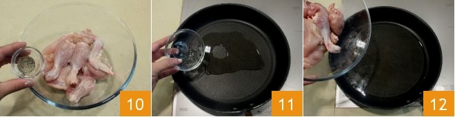 y la pimienta 10; luego masajea la carne con las manos para que coja sabor. Calienta el aceite de cacahuete en una sartén grande antiadherente 11 y añade el pollo en trozos 12 para freírlo.