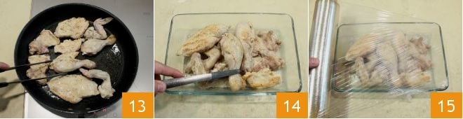 Gíralo por ambos lados 13 y cocina durante unos 4-5 minutos por lado; luego retira el pollo y ponlo aparte en un lugar caliente 14, cubierto con film transparente 15.