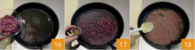 En la misma sartén donde has dorado el pollo, vierte el picadillo de cebolla y ajo 16, añade el comino en polvo 17 y mezcla 18, dejando que el picadillo se sofría y se ablande durante unos instantes.