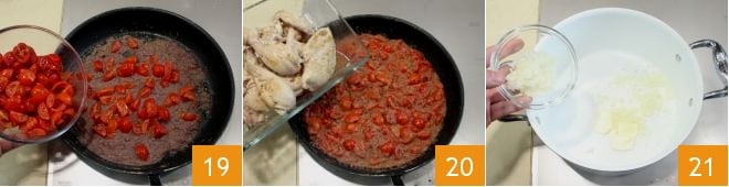 Luego añade los tomates cherry 19 y continúa la cocción durante unos 10 minutos hasta que los tomates liberen su jugo y se deshagan ligeramente. Añade ahora también los trozos de pollo 20, deja que coja sabor y luego cubre con agua o caldo de pollo caliente y tapa con una tapa: cocina por al menos 40 minutos a fuego muy bajo y controla de vez en cuando la cocción para que no se seque demasiado el líquido. Mientras tanto, prepara el arroz pilaf: pica finamente la cebolla y en una cacerola amplia pon a derretir la mantequilla, añade la cebolla picada a la mantequilla derretida 21 y deja que se ablande a fuego bajo durante unos 15 minutos, hasta que se vuelva transparente: cuidado de no dejar que se dore.