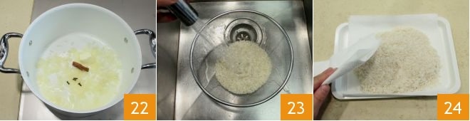 Añade la canela y los clavos de olor 22 y mezcla durante otros dos minutos. Mientras tanto, enjuaga el arroz bajo agua corriente, déjalo escurrir y secar completamente en una bandeja forrada con papel absorbente 24.