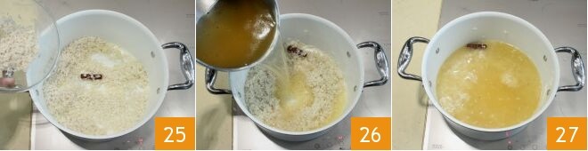 Añade el arroz en la cacerola 25 y déjalo tostar unos instantes mezclando con una espátula de madera. Luego añade todo el caldo (26-27). Cubre la cacerola con una tapa (no debe haber escapes) y deja cocinar por al menos 18-20 minutos a fuego moderado hasta que el caldo se haya secado completamente. Una vez cocido y bien seco, retira el arroz pilaf del fuego, desmenúzalo bien con un tenedor y resérvalo.