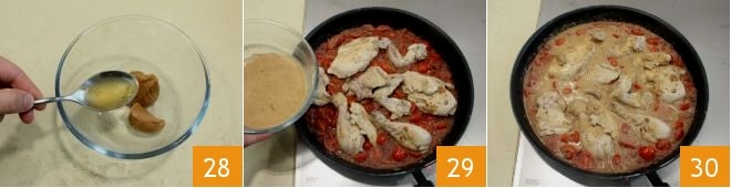 En un bol pequeño, disuelve la mantequilla de cacahuete con 2-3 cucharadas del caldo de cocción del pollo 28 y añádela a la cacerola 10 minutos antes de terminar la cocción del pollo 29. Una vez finalizada la cocción 30, ¡sirve el estofado especiado de pollo y cacahuetes caliente acompañado de arroz pilaf!