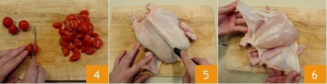 Lava también los tomates y córtalos en cuartos 4, luego dedícate al pollo: límpialo eliminando la piel exterior haciéndole un corte con un cuchillo muy afilado 5; una vez eliminada toda la piel 6, elimina también las diversas partes de grasa que puedan estar presentes