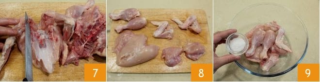 y luego corta el pollo en trozos (7-8), retirando cuidadosamente también los huesecillos. Coloca el pollo en un bol, añade la sal 9