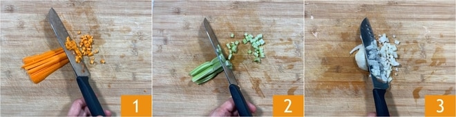 Para realizar los supplí de pasta y patatas, primero preparad el caldo de verduras y mantenedlo caliente. Comenzad con las verduras para el sofrito: limpiad y cortad en cubos de 1 cm las zanahorias 1, el apio 2 y la cebolla 3.