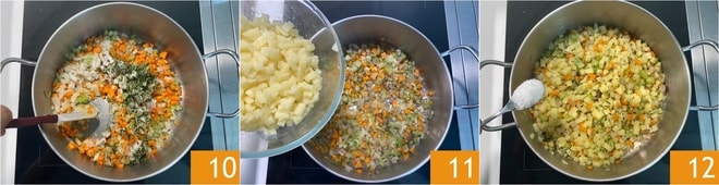 Sofreíd a fuego medio-alto durante 5 minutos, removiendo a menudo 10. En este punto, añadid las patatas 11 y sal 12.