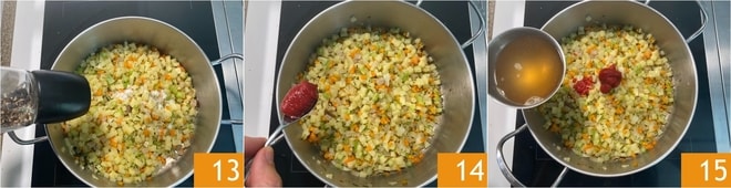 Sazonad con pimienta negra 13 y el concentrado de tomate 14, luego cubrid todo con una parte del caldo de verduras 15.