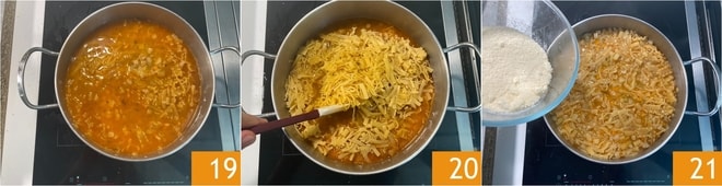 Continuad la cocción a fuego medio durante unos 15 minutos, asegurándoos de que el caldo continúe hirviendo a fuego lento 19. Removed frecuentemente para evitar que la pasta se pegue al fondo 20. Una vez cocida, apagad el fuego y añadid el Parmigiano Reggiano rallado 21.